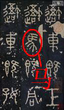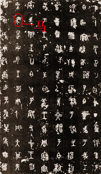 秦始皇统一六国,命丞相李斯“书同文”,李斯以秦篆和秦隶统一六国文字,对大篆加以去繁就简,改为小篆。马字演变到篆书时,使早期粗细不匀的线条变得均匀柔和,它们随实物画出的线条十分简练生动;字形结构趋向整齐,逐渐离开了图画的原形,奠定了方块字的基础。石鼓文上的马字写作: