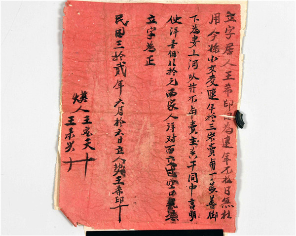 这张卖身契是新乡县文管所在七十年代征集的,2000年时所里对近现代文物调查登记时重新上账的 。红纸黑字,保存状况尚好。 卖身契纸长25.8厘米,宽20厘米,墨书文字自右向左竖行古书体。2000年登记时,河南省博物馆定的是二级文物。全文释读如下(标点符号为作者释读方便所加注):
