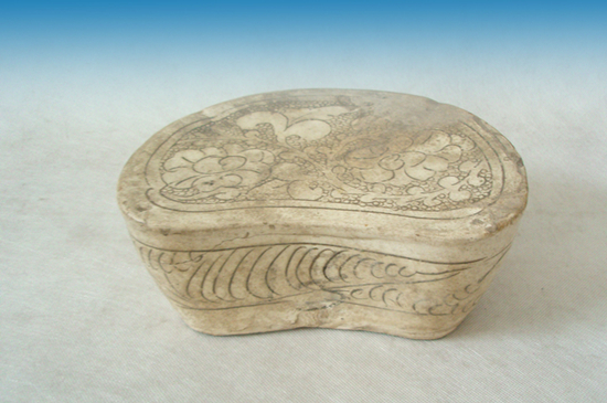 珍珠地划花瓷器系模仿金银器錾胎工艺烧造而成,起源于唐代,盛行于宋代 ,这件珍珠地划花瓷枕,长21厘米 ,宽15.5厘米 ,高8厘米。枕呈不规则园形,稍内凹,枕面以戳印的细密珍珠状小圆圈为地,主题纹饰为划花折枝牡丹,牡丹花姿态优美,构图精练,划饰花蕊、花叶及边框,构图线条流畅。枕体四周施以简洁明快的波浪纹,釉色莹润,白中闪黄,素底露胎。