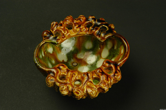 这件三彩杯高4厘米、纵9.4厘米、横9.5厘米,通体与汉代酒具双耳杯相似,杯呈椭圆形,圜底,口部为不规则圆形,两端为弧形沿,两侧沿内折,并各透雕对称的四个圆孔。杯外部浮雕花叶纹,衬以乳钉纹,犹如珍珠地,造型精巧玲珑,杯内在棕色底釉上施黄、绿、白三色,仿佛散落的梅花,错落有致,均匀的点缀于杯里,外壁施棕红色釉,色调浑厚、润泽,堪称三彩中的精品。观之有“乱花渐欲迷人眼”的感觉。