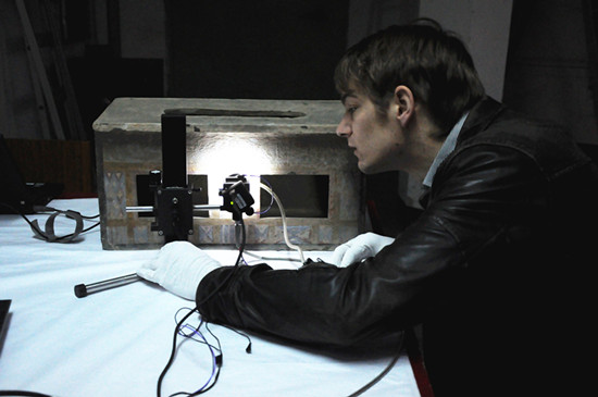2014年3月12日,两名“洋”博士在洛阳古代艺术博物馆和河南古代壁画馆展厅工作。这是中国文化遗产研究院与瑞士苏黎世大学合作开展的“汉紫”颜料的综合研究项目。