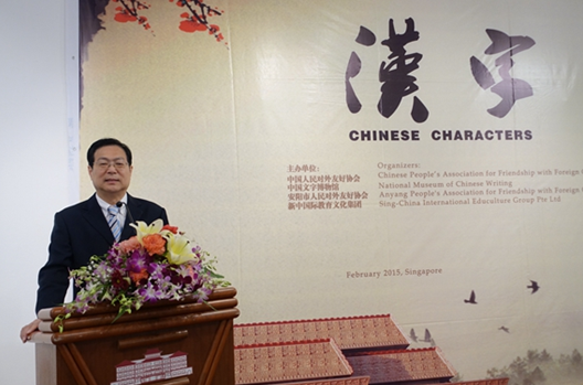 中国人民对外友好协会副会长谢元为《汉字》国际巡展新加坡展致开幕词