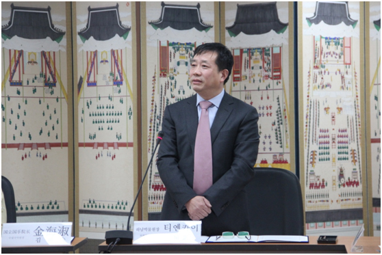 首尔中国文化中心主任史瑞林代表中华人民共和国驻韩国大使馆、首尔中国文化中心在仪式上发表贺词。他说,2013年“中韩人文交流合作共同委员会”召开第一次会议以来,在中韩两国人文交流方面开展了诸多项目,使中韩两国人文交流日益紧密,2014年度两国之间的互访人员达1000万人次。中韩两国有着悠久的友好交流历史,作为中韩交流的重要组成部分文化交流一直以来发挥着重要、独特的作用。河南博物院与韩国国立国乐院的合作交流是2015年“中韩人文交流共同委员会”框架内的重要项目之一,相信双方会以签署“合作交流协议书”为契机,相互借鉴、合作共赢,为中韩两国的人文交流作出应有的贡献。