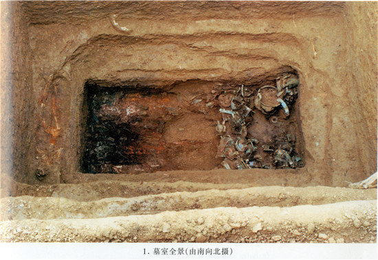 该墓为一座大型竖穴土坑墓。长4.5、宽2.9、深5.7米,面积13.05平方米。墓室四周有二层台,墓底中部有长方形腰坑。葬具包括棺和椁。墓主人头向东,足朝西。墓室内有4名殉葬人。其中二层台上1名、椁室内2名,腰坑内1名。