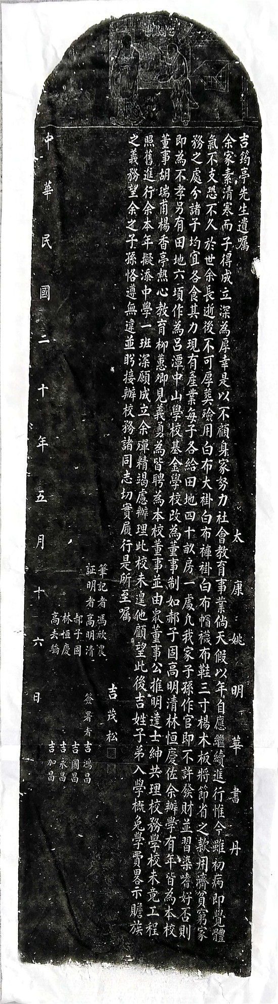 这通碑刻重见天日,不仅可以帮助我们了解吉筠亭先生的生平事迹、家庭状况,以及携子吉鸿昌等创办扶沟吕潭中山学校的过程,同时也对我们重新认识吉鸿昌的家世和成长背景,开展爱国主义教育和廉政教育,具有一定的社会现实意义。 (李运宽拓片,梁军阳摄影)