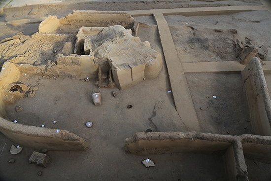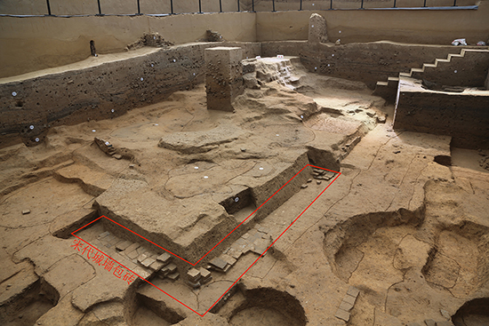 在瓮城内主城门南北两侧近城墙处各清理出一座高台房屋建筑基址。两座建筑南北对称,形制布局相同,南北进深均为10.8米。沿建筑台基的东侧和北侧均发现有方形磉墩,边长1.5米,间隔2.4米。在北侧建筑的北部同时期灰坑中清理出迦陵频伽、灰陶套兽、龙纹瓦当等建筑构件。