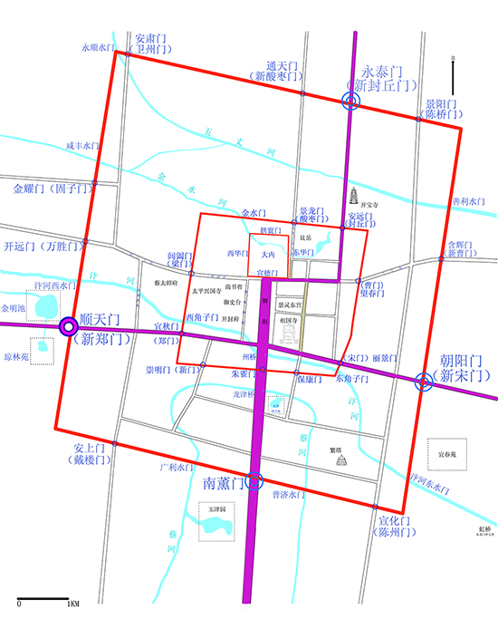 北宋东京城顺天门始建于五代后周世宗显德二年(955年),时称“迎秋”门,宋太宗太平兴国四年(979年)改名“顺天”门。因向西直通郑州且与内城上的郑门相对,故又称“新郑门”。顺天门是位于宋东京城外城西墙上连接御道的正门,沿用至金代,于公元1232年金哀宗弃城南逃后废弃。