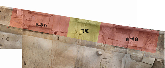 在北门道西口进深4米处发现有门限槽遗迹,门限槽平面呈长条形,南北纵贯门道。门限槽开口长5.3米,宽0.35~0.55米;剖面呈倒梯形,斜壁、平底,底部长5.2米,宽0.3~0.42米;现存深度0.3~0.5米。在北门道与北墩台交界处清理出几处非均匀分布的地栿石坑,这些残留的地栿石坑多近方形,边长0.5~0.7米。