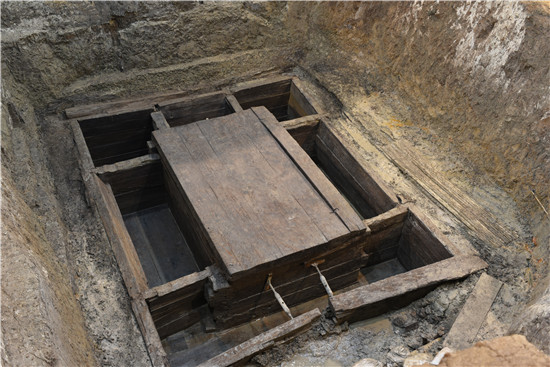 从2015年8月起,河南省文物考古研究院开始发掘墓葬,截止目前,已将上部填土清理完毕,露出椁室,并将后室槨板打开。八号墓平面呈“甲”字形,坐西向东,方向95°,由墓道、墓室两部分组成。墓葬全长18.5米左右,面积127平方米左右。残存上口长10.1~10.9米,宽9~9.4米。墓道东部被现代坑打破,大致呈长方形,长6.0~6.4米,宽3.2米左右。墓室平面大致呈方形,自上而下呈阶梯状逐层内收,共发现5级台阶。墓室上部没有发现封土,现地表北部低于南部1米左右。墓室填土中,上部1.2~1.5米为结构致密的黄灰色填土,之下即为青膏泥。距地表4.5~5.1米至椁板表面。椁室平面呈长方形,由主室、前室、南侧室、北侧室以及北后室、中后室、南后室组成,总长6.2~6.3、宽4.8~4.9米。前室中部有过梁,南北两部分形成相通。前室和南、北侧室被盗严重,主室和后室保存完好。椁板上部发现覆盖物,目前大致可确定有三层:最下部为宽竹片为龙骨的竹席,之上为窄竹片编成的竹席,再上为苇草或稻草编织的草苫,椁室与墓壁之间用成束的稻草填充。前室虽然被盗严重,仍发现不少陶器和彩绘漆木器。陶器主要是陶鼎、方座簋,漆木器数量较多,有案、耳杯、豆、盒等,以耳杯最为多见。南侧室发现有床榻、竹席、木俑、木几、投壶箭以及铜镜、铜剑等,其中,竹席髹红、黑漆几何纹,蔑宽0.25厘米,长度2米左右。北侧室发现有木质车舆、弓、箭、箭囊、瑟,以及铜矛、铜戈、车軎、车辖等。矛为彩色髹漆长木柄,伞盖破坏严重,散落在椁室中。南后室保存完好,发现有陶方壶、圆壶、鉴等仿铜陶礼器,表面多施彩绘。中后室发现40余个荷叶包裹,以及雕刻木案、陶鬲、陶罐等。初步观察荷叶包裹内有水稻、小米等粮食。