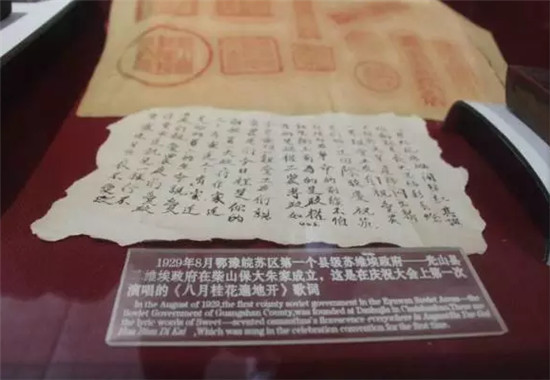 1929年8月鄂豫皖苏区第一个县级苏维埃政府——光山县苏维埃政府在柴山保大朱家成立,这是在庆祝大会上第一次演唱的《八月桂花遍地开》歌词。