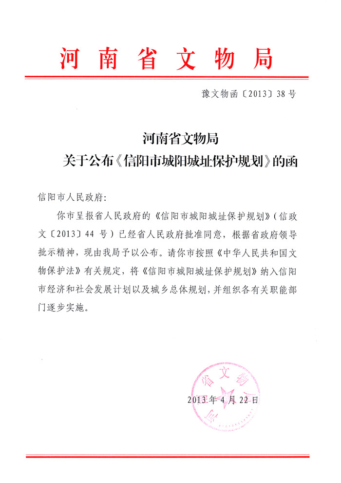 关于公布《信阳市城阳城址保护规划》的函
