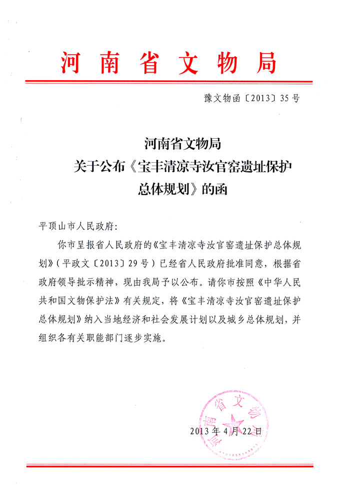 关于公布《宝丰清凉寺汝官窑遗址保护总体规划》的函