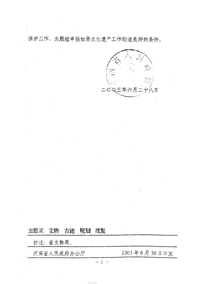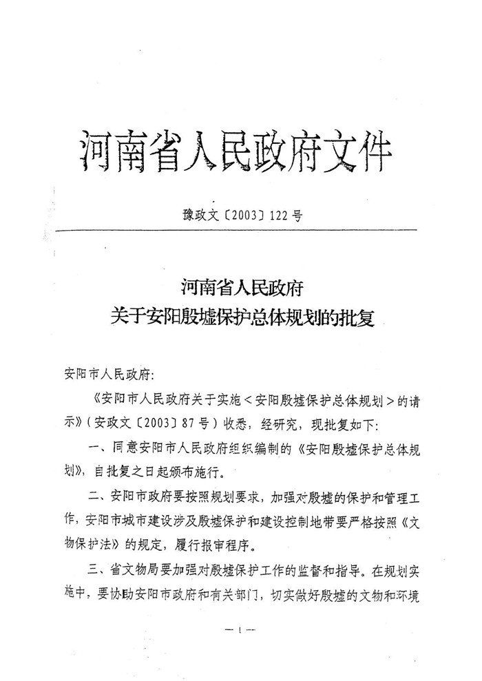 河南省人民政府关于安阳殷墟保护总体规划的批复