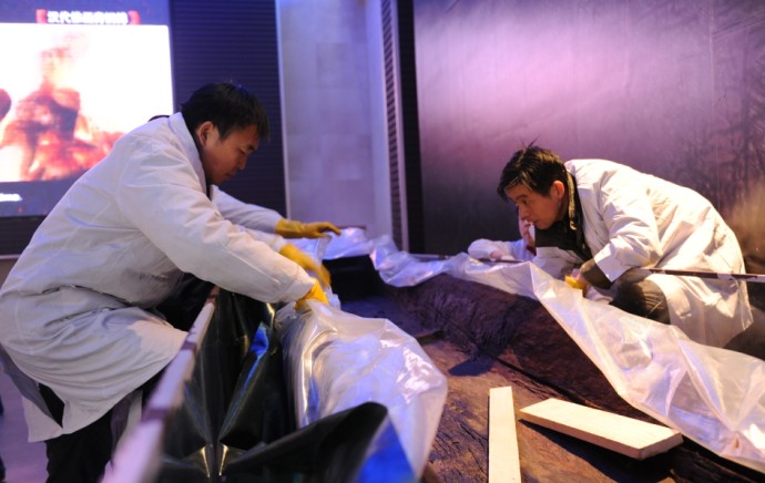 河南省文物科技保护中心博士主任陈家昌介绍说:“独木舟出土地层硫化物含量高,里面的可溶性盐,就像我们平时吃的盐一样,如果遇到高湿天气,就会潮解,木头就会受到侵蚀,环境干燥,就会造成湿胀干缩的破坏。所以脱水保护的第一步就是脱盐”。亦即为它“洗澡”。“洗澡”用的浸渍液是比纯净水还有纯的“蒸馏水”,一次浸泡就用掉满满550升(相当于30桶饮水机桶装水),6位工作人员为其“擦身”,待其PPM值接近纯净水的数值,两年后脱盐完成后方可“出浴”,之后再脱水定型、修复补全、防霉杀菌及封护处理,整个过程约需5年以上时间。