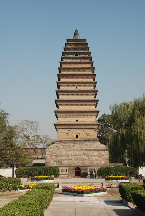 沁阳天宁寺三圣塔坐落在沁阳市城区东南隅的天宁寺旧址上。天宁寺始建于隋,时名长寿寺。唐代改名大云寺,并在寺院建木楼阁。金代更名天宁寺,金大定十一年(1171年)在唐建木楼阁处修塔。寺院早废,仅存金塔和唐“大云寺皇帝圣祚之碑”。塔平面为方形,塔门面南,由基座、塔身、塔刹三部分组成,叠涩密檐,共十三层,高32.76米。该塔外观仿唐,内部结构又似宋代作法,把回廊走道、竖井、涵洞、壁龛、心室、拱券、攒顶等工艺巧妙结合,砖、木、石并用,别具风格。塔门上方有青石题额一方,镌刻“中天一柱”四个大字。塔内存金代建塔题记“舜都栖岩寺髑髅和尚铭"和一佛二菩萨石刻造像六处。具有较高的历史、科学和艺术价值。2001年6月25日,国务院公布其为第五批全国重点文物保护单位。
