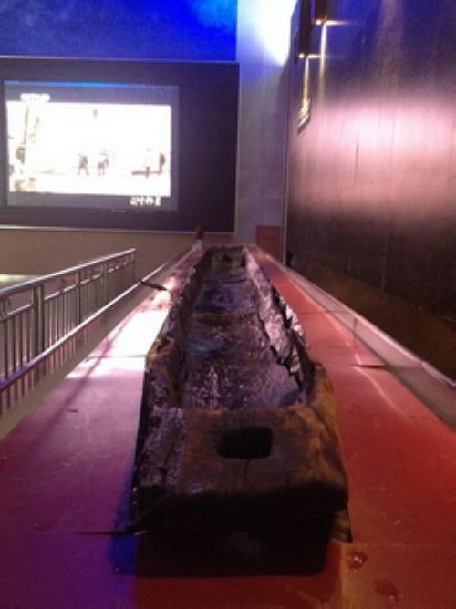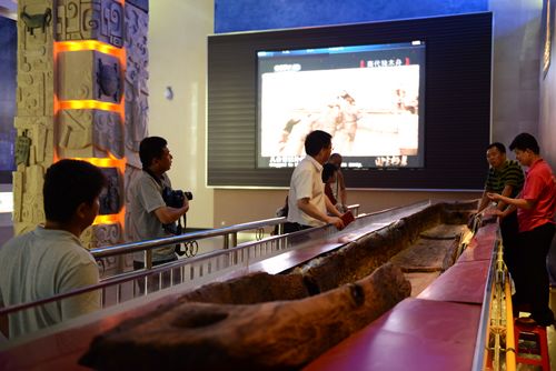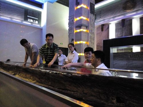 现陈列在信阳博物馆的“镇馆之宝”淮河独木舟于2009年7月发现于息县城郊淮河西岸,舟长9.28米,最宽处0.78米,高0.6米,整个舟体由一圆木剖凿而成,经加速器质谱(AMS)碳-14测定,其树种为母生树,系热带树种,现江淮地区已经绝迹。年代为3185±40、3170±35,树轮校正后年代为距今3500年前,是我国迄今考古发现最大、最完整的商代独木舟,堪称“中原第一舟”。由于独木舟沉于淮河水底几千年,舟体绝对含水率普遍在200-300%之间,局部腐蚀严重的部位,其绝对含水率可达600%以上,木纤维素含量只有正常木材的20-30%。必须进行脱水处理,才能达到长期保护的目的。这是对木制文物的一种科学保护措施。为此,信阳博物馆委托河南省文物考古研究院、河南省文物科技保护中心编制保护方案,并报请国家文物局批准,于2012年正式开始实施脱水处理。