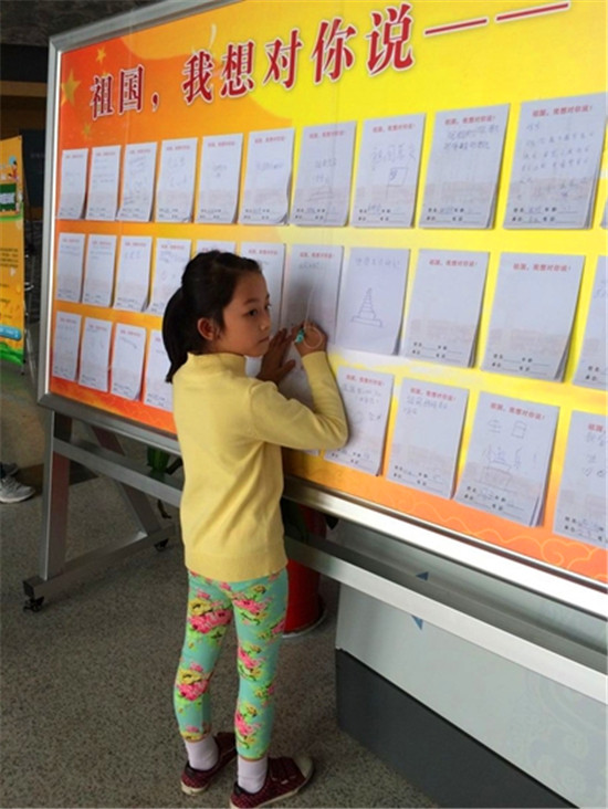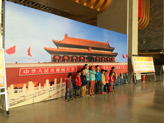 “祖国,我想对你说……”是国庆期间互动性最强的一个活动,工作人员在博物馆大厅上方悬挂了鲜艳的五星红旗,并制作了天安门城楼的巨幅图片竖立于国旗之下,人们仿佛来到了天安门广场,来到了祖国的心脏,同全国人民一起庆祝伟大祖国的65周岁生日。许多观众在此驻足留影、拍照,“祖国母亲,生日快乐”、“祖国万岁”“亲爱的中国,我爱你” ….签名簿上,大家纷纷用自己的方式表达对祖国母亲的热爱和赞美之情。在大厅的东侧是“您的名字叫国庆”区域,在国庆节期间,如果是10月1日生日或者名为“国庆”的观众,可以凭身份证在此区域领取一份专属纪念品,以这种方式表达对您及祖国母亲的祝福。据统计,国庆期间共有近两万人前来参加互动活动。