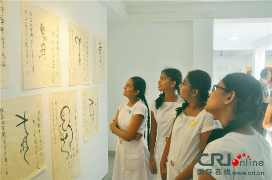 斯里兰卡学生参观展览时被古老的中国汉字吸引。