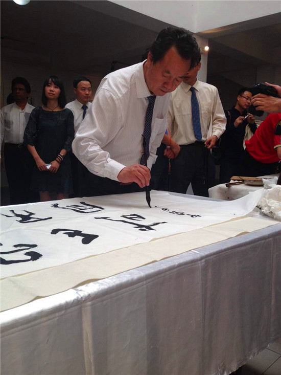 中国文字博物馆常务副馆长、中国书法家协会会员冯克坚先生现场创作“大美之国 和而不同”的书法作品。