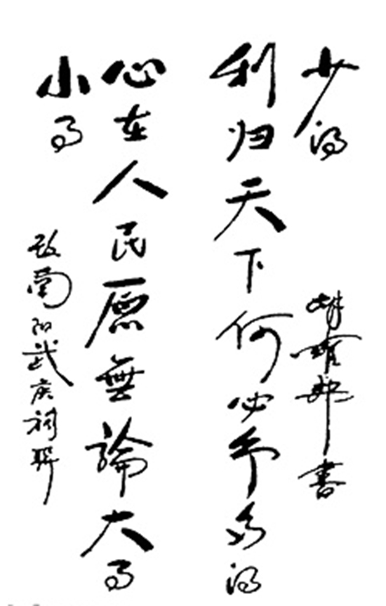 1958年9月,时任中共中央委员、团中央第一书记的胡耀邦到河南检查工作,并到南阳武侯祠视察时,当他大拜殿两边悬挂有清代南阳知府顾嘉蘅撰写的楹联:“心在朝廷原无论先主后主;名高天下何必辨襄阳南阳。”沉思片刻,遂口赋一联:“心在人民原无论大事小事,利归天下何必争多得少得。”一天后,胡耀邦在南阳市人民会场向市直机关干部作关于国内形势的报告时,又引用了他改写并口赋的这幅楹联,对在场的党员干部进行思想教育,以示勉励。1986年4月,胡耀邦又将他于1958年在武侯祠改写并口述的楹联,亲笔写于纸端。2002年春,南阳市博物馆(卧龙岗武侯祠)将胡耀邦亲笔题写的楹联进行刻制,并悬挂于南阳武侯祠大拜殿两侧。