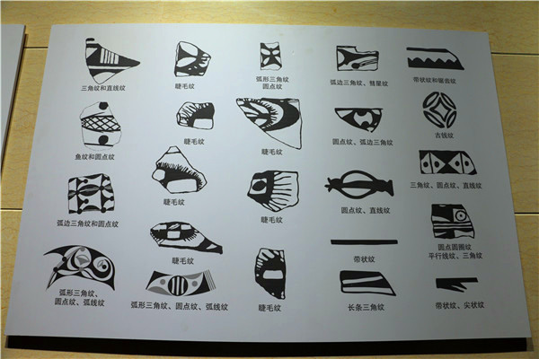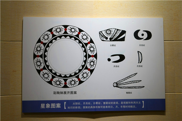 精美的彩陶文化再现了仰韶时期先民们对事物的观察与崇拜,对美的不懈追求。这些绘有太阳纹、月亮纹、日晕纹、彗星纹、星座纹等天文星象图案的彩陶片,数量较多,内容丰富。据了解,大河村先民们为了生活和生产的需要,经常观察认识和总结一些自然现象和变化规律,其中包括与人类生存关系最密切的太阳、月亮和星体的一些运行和变化。望着这些纹饰各异的陶片,我们可以充分想象5000多年前先民们生活的世界是怎样的多姿多彩。