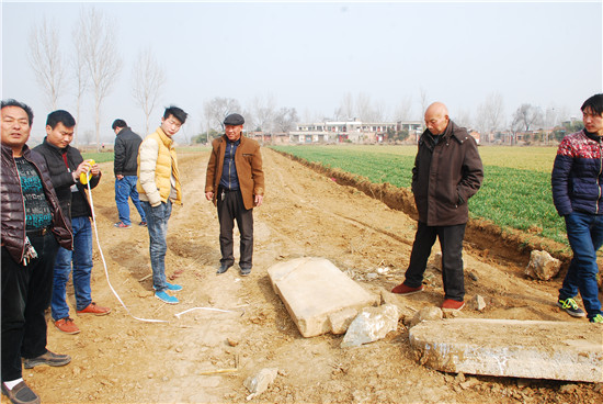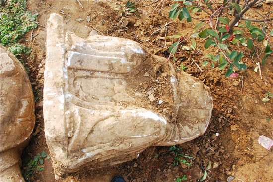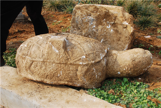 近日,南阳市镇平县王岗乡砚台村修路施工现场发现石碑、残损祖师雕像、赑屃、方形莲花碑座等碑刻石雕。