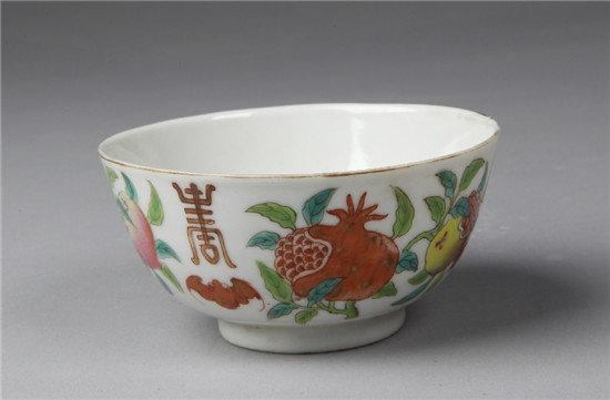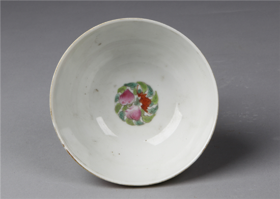 该碗通高5.5厘米,口径11厘米,底径5厘米,重127.5克。器身均匀的绘着折枝的佛手、寿桃、石榴等果实,其间隔区域内彩绘着蝙蝠和“寿”字纹图案。碗心彩绘团花图案,内有两支寿桃和一只蝙蝠,碗底圈足内红彩书“大清道光年手制”六字篆书款。整个器型优雅,色泽明快,图案疏朗,构图舒展,意境深远给人以赏心悦目的感觉。