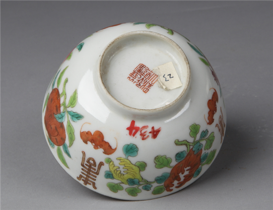 近日,在对淮阳县太昊陵风景管理处可移动文物数据审核中,发现了一批精美的瓷器。其中有一件清道光五彩瓜果神福寿纹碗特别吸引了我。