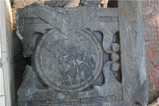 夹柱石分上下两部分,上部分采用圆雕技法雕刻胡人骑狮形象,胡人凸眼,高鼻,笑口露齿,连腮卷须,双耳垂肩佩戴耳环,头束布巾,腰束短衣窄袖服装,足蹬长马靴骑在狮身上,双手紧扶狮头。狮子鼓眼阔鼻,张口卷舌露齿,卷毛,胸佩花环,三足立于须弥基座;下半部采用浅浮雕技法,上部雕一角锦铺基座,锦铺边阴刻回纹,内浮雕祥云,中部双弦纹鼓形,鼓面浮雕蝙蝠、鹿、灵芝、喜鹊、祥云,寓意“福禄寿喜”,鼓外雕变形夸张鸟纹上下对称围于鼓外,下部雕凤凰一立一翔互视于牡丹丛中,边饰缠枝花纹。