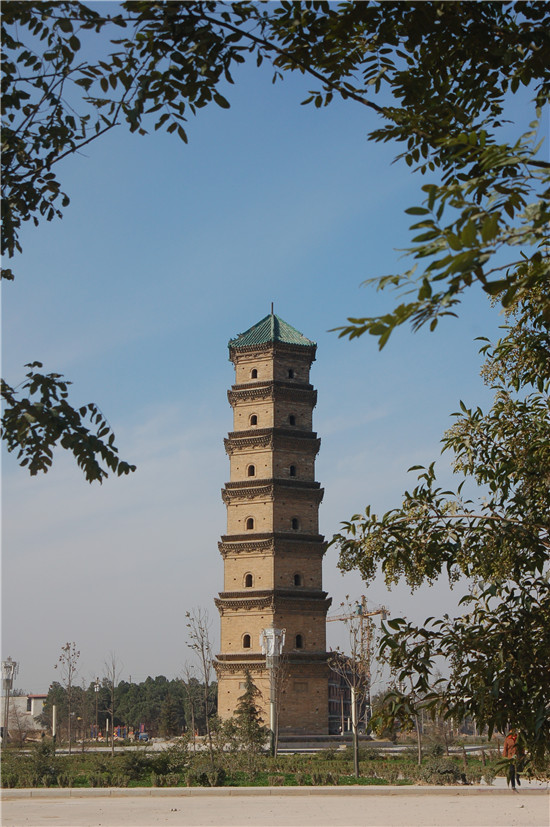 镇国塔又名灵应塔,位于卫辉市建设路东段,河南省第二批文物保护单位,创建于明万历十三年(公元1585年)。镇国塔为七级楼阁式砖塔,高34.5米, 每层南北各辟一券门,塔内置塔心室、塔道,内设有佛龛21个,佛龛与望窗相交,整座塔逐层收敛至顶端呈锥状,高度均匀递减,外檐收放尺寸自然得体,既保护塔墙免遭雨雪侵蚀,冲刷,又给塔体以美的享受,是研究明代建筑和砖石雕刻艺术的宝贵资料。
