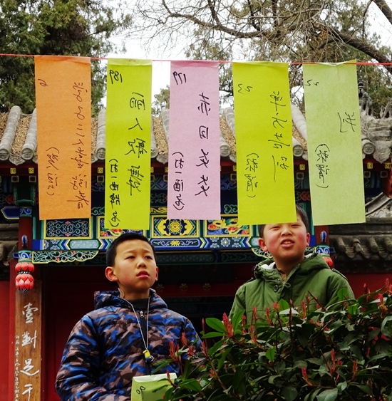 正月十五、十六上午,南阳卧龙岗武侯祠在院内悬挂千余条精心制作的谜语,来自南阳城区的谜语爱好者纷纷云集卧龙岗,在游览景区之中,品味中国传统谜语文化。南阳卧龙岗谜语有奖竞猜活动已举办多届,本届谜语以三国文化、诸葛亮文化为主,内容丰富多彩,涵盖多个领域,谜语数量、质量、奖品设置及游客参与程度均超过往届。家长携儿童参与谜语竞猜,让孩子从小接触中国传统文化,特别是优秀厚重的民俗文化,是本届卧龙岗谜语有奖竞猜活动的最大亮点。