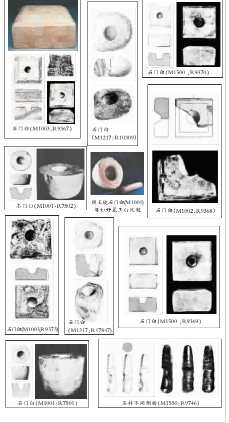 一、石门臼之鼻祖,形制精美者如殷王陵1003号大墓出土2件(见附图M1003)。大小有别,其中一件有纹饰,另一件素朴,非一对。形制相同,质料为白色黄斑大理石雕成。